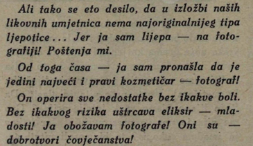 U ovom navedenom dijelu kozerije usputno se reklamira Klub likovnih umjetnica o kojemu se i u predmetnom broju lista piše, što nije rijedak način na koji Zagorka u ovoj rubrici dodatno ističe ili se referira na neku tematiku sadržaja lista. I dok, dakle, krajem 1930. piše o fotoaparatu kao ultimativnom kozmetičarskom rješenju, već sljedeće godine u kozeriji „Moja fotografija“ pojašnjava da ju fotograf nije mogao fotografirati zbog njezine vanjštine, pa ju upućuje na rendgen jer sigurno ima lijepu unutrašnjost, da bi se zaključno ispostavilo da ni tamo ništa nije na svojem mjestu te da joj je samo jezik dobar.