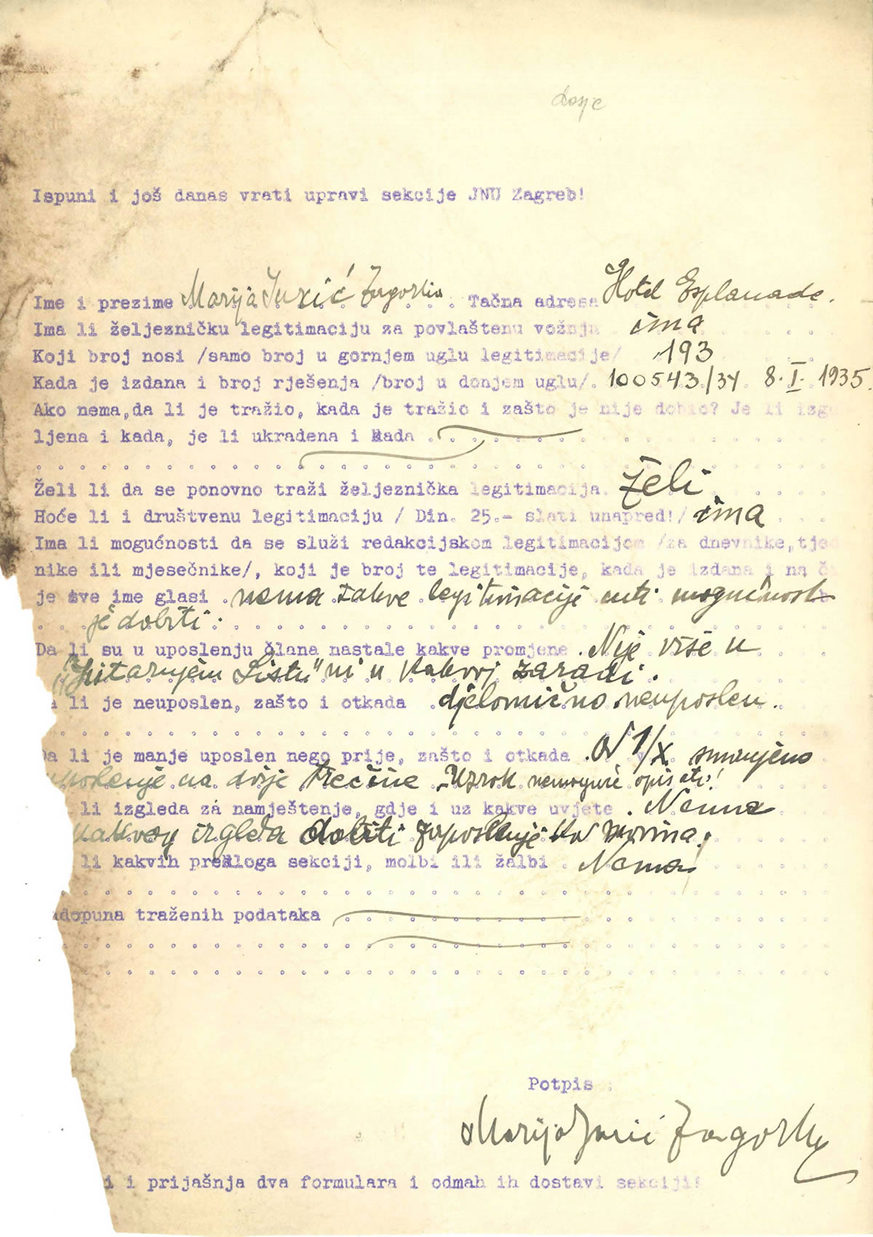 Zagorka ispunjava za potrebe legitimacije pri Jugoslavenskom novinarskom udruženju – Sekcija Zagreb; Preuzeto: Arhivski fond Marije Jurić Zagorke https://zagorka.net/arhivski_fond/zaposlenje-i-legitimacija-pri-jugoslavenskom-novinarskom-udruzenju-sekcija-zagreb-ispunjen-od-strane-m-juric-zagorke/