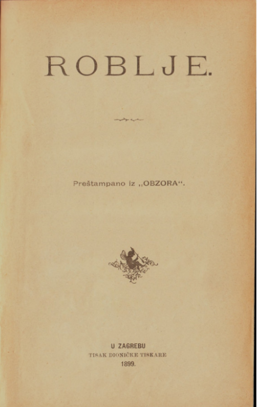 Marija Jurić Zagorka svoj je prvi roman Roblje napisala 1899. godine, a objavljen je u Obzoru. Iste godine roman izlazi u obliku knjige, zahvaljujući biskupu Strossmayeru koji je pokrio troškove tiskanja.
