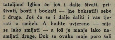 4. Iglica. 1929. Uzduž i popreko: Ne daju mi da se raskokodačem. Ženski list, god. V, br. 10, str. 45.