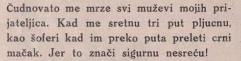 Nikad muž ne vara ženu. Muževi su uvijek siromaci, dobri jaganjci, brižljivi supruzi, koji nikada ni u snu ne pomišljaju, da osim njihove žene postoji još koja druga! … Vjernost, to je muškima druga priroda! Ali žene! Te žene! One su uvijek nevjerne, uvijek imadu ljubavnike i dok se muž muči i radi, one pozivaju k sebi ljubavnika! A kad muž iznenada dodje kući dogadja se uvijek dvoje: ili ljubavnik skoči kroz prozor (naravno ako je prizemno!) ili ga žena sakrije u ormar! I tako je ormar postao najjačim zakloništem ljubavnika“ (1932., br. 11, str. 40).