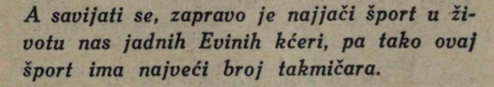 „Hoćeš li biti na ovoj zemlji žena kojoj je dobro – moraš biti lijepa. Ako si naprotiv muž – prosto ti bilo izabrati sebi najzdepastiju životinju modelom svojem tijelu – i najkvrgastiju glavu nosoroga svojim licem – uvijek će se naći žene, koje će ga proglasiti Adonisem, a muževi će ga nazvati »najsimpatičnijim dečkom«“ (1935., br. 1, str. 40).