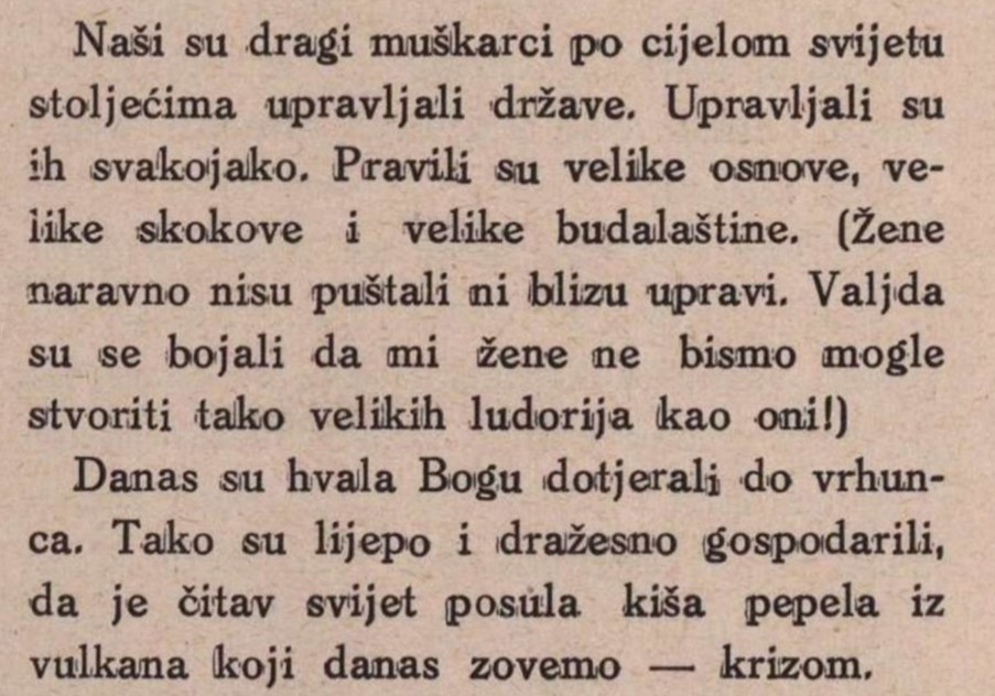 „Da naši muževi u istinu drže samo jedan ugao kuće to dokazuje današnja – kriza! Držali su taj ugao i drže ga tako slabo, da se klimaju i oni i – ugao!“ (ibid.)