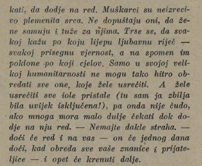 – Ne gospodjice, ja sam oprobala vašeg ideala, koliko je spreman da za vas umre!…“ (1937., br. 2, str. 40).